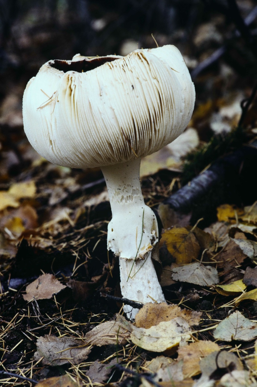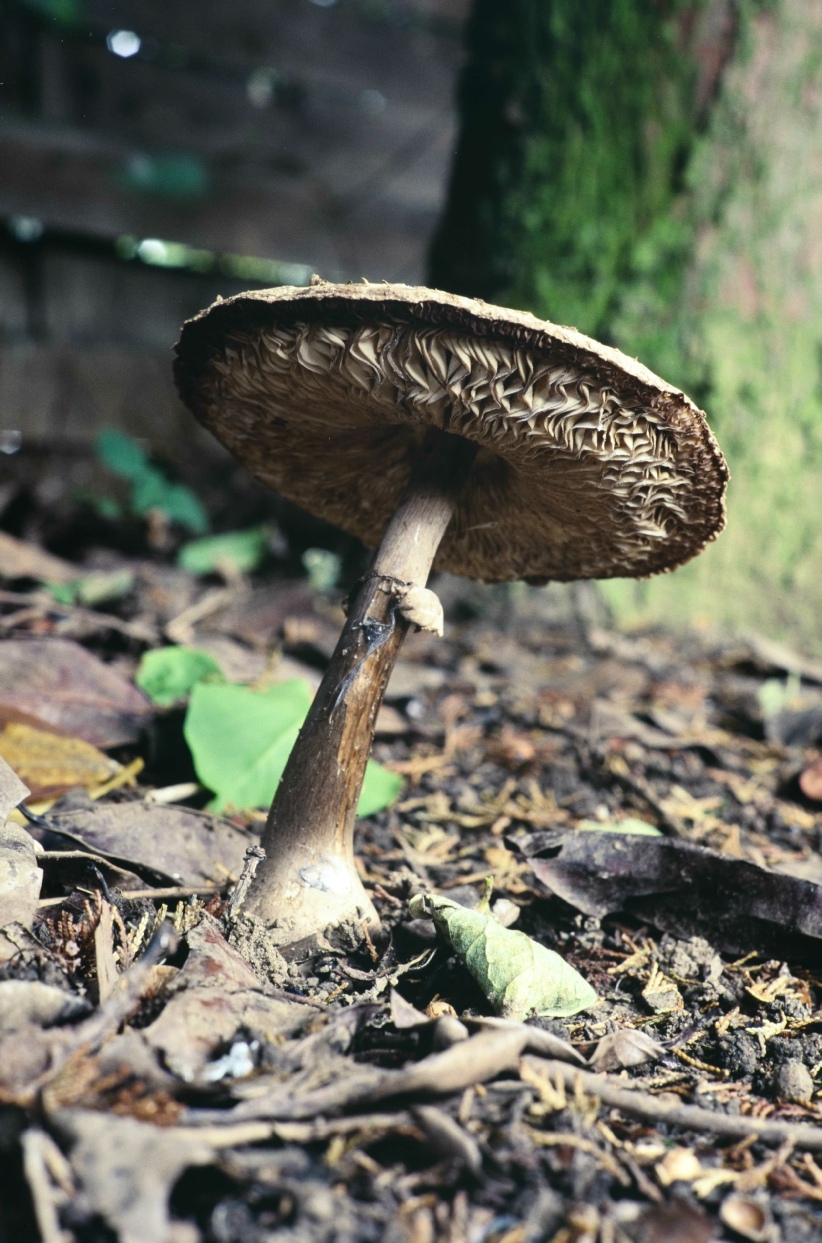 Getting low again to get a photograph of a complete mushroom from the ground to the cap, showing stem, ring, gills and cap.