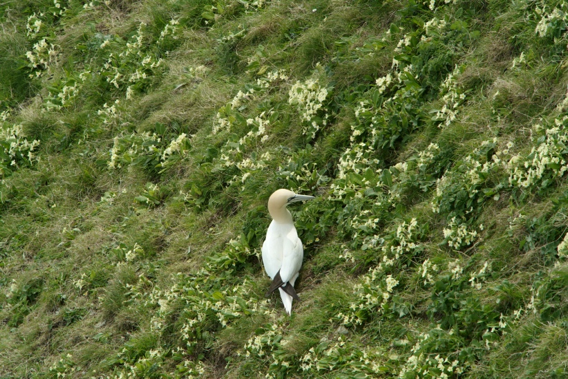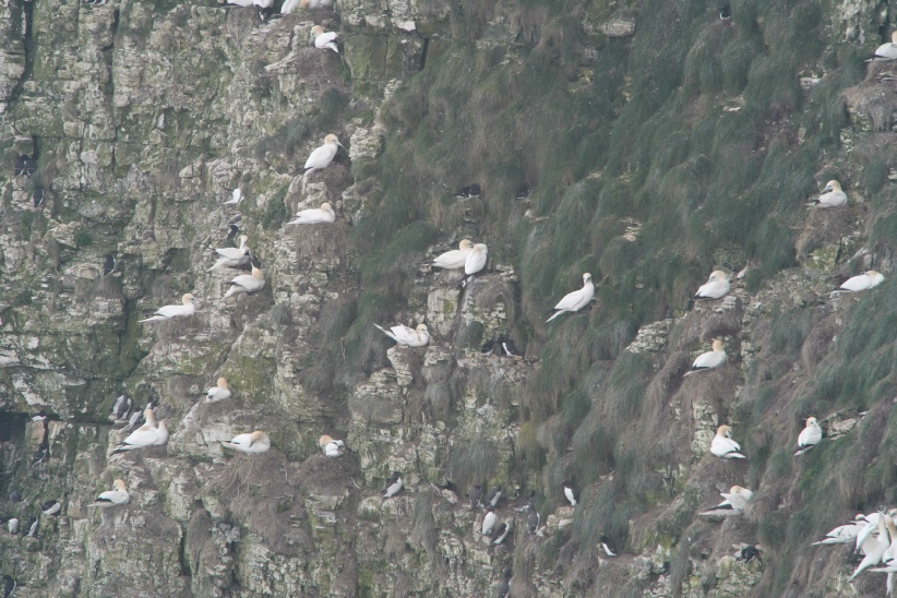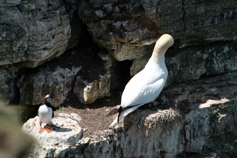 The little and large show; this photo shows just how large the gannet is, or how small the puffin is, depending on how you look at it.